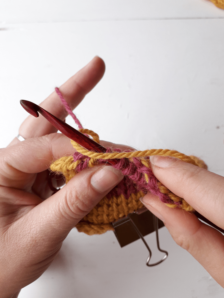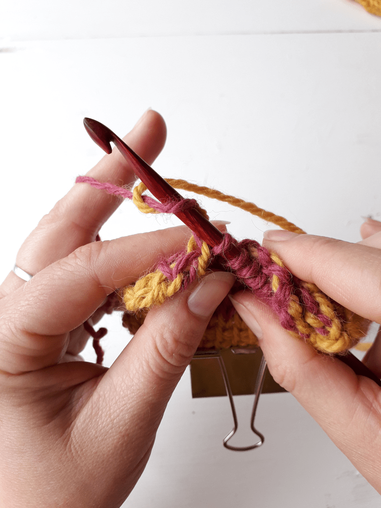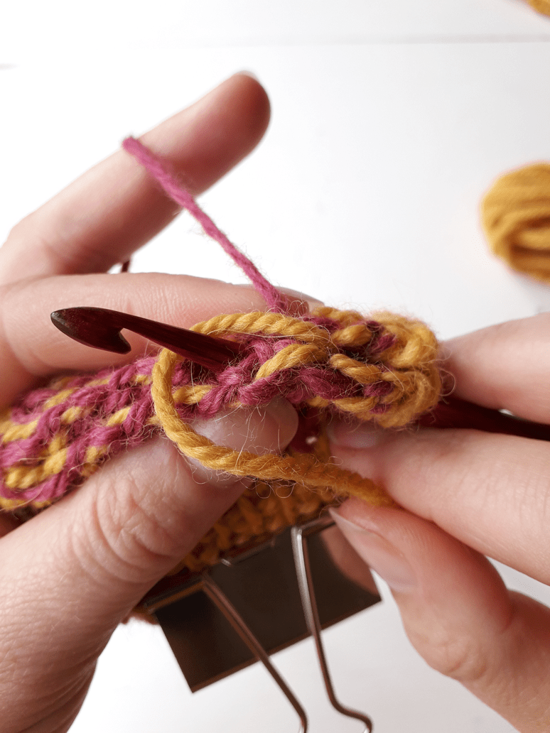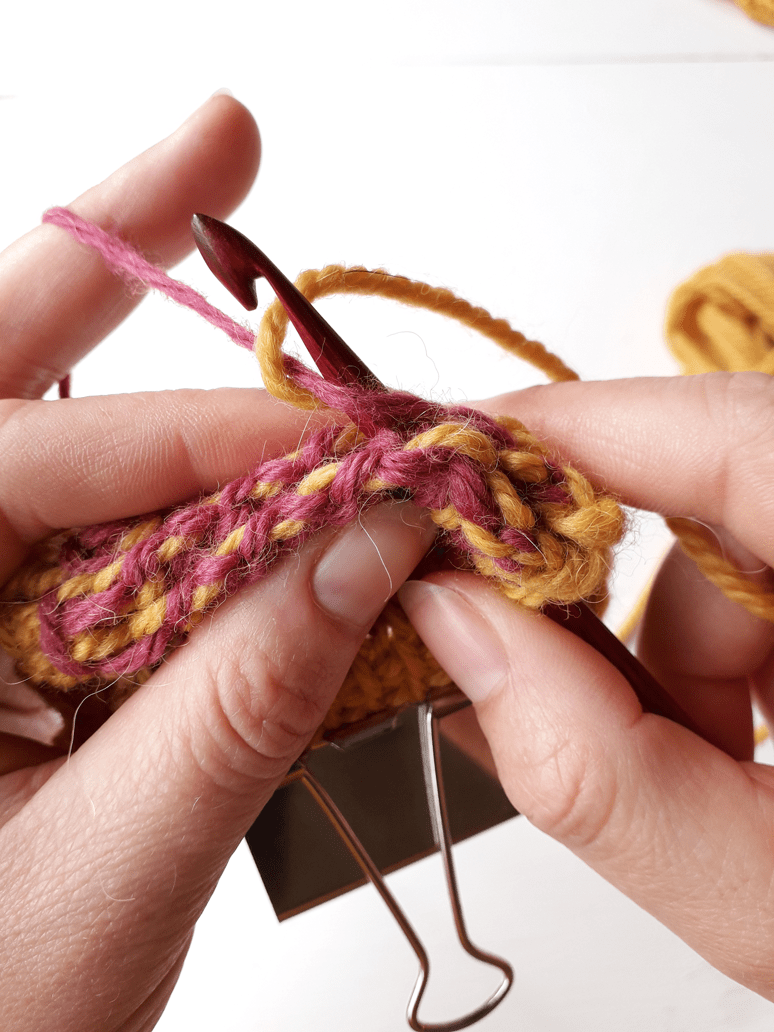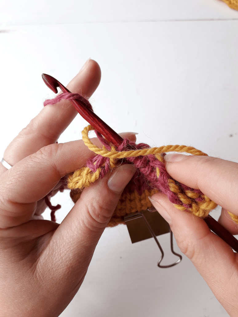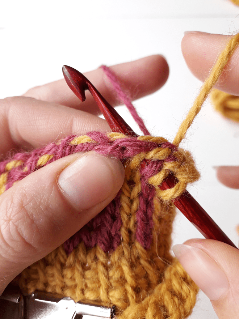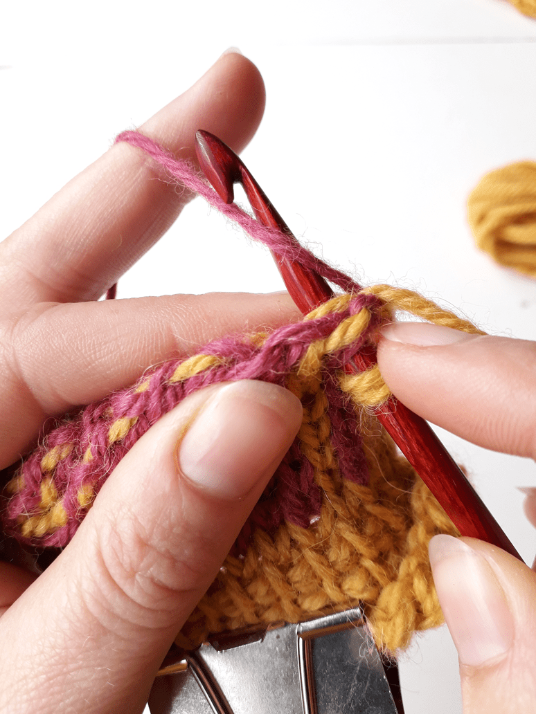 The resulting stitch will be CC (pink) but the back of the st will have the strand of MC (yellow) running through it.