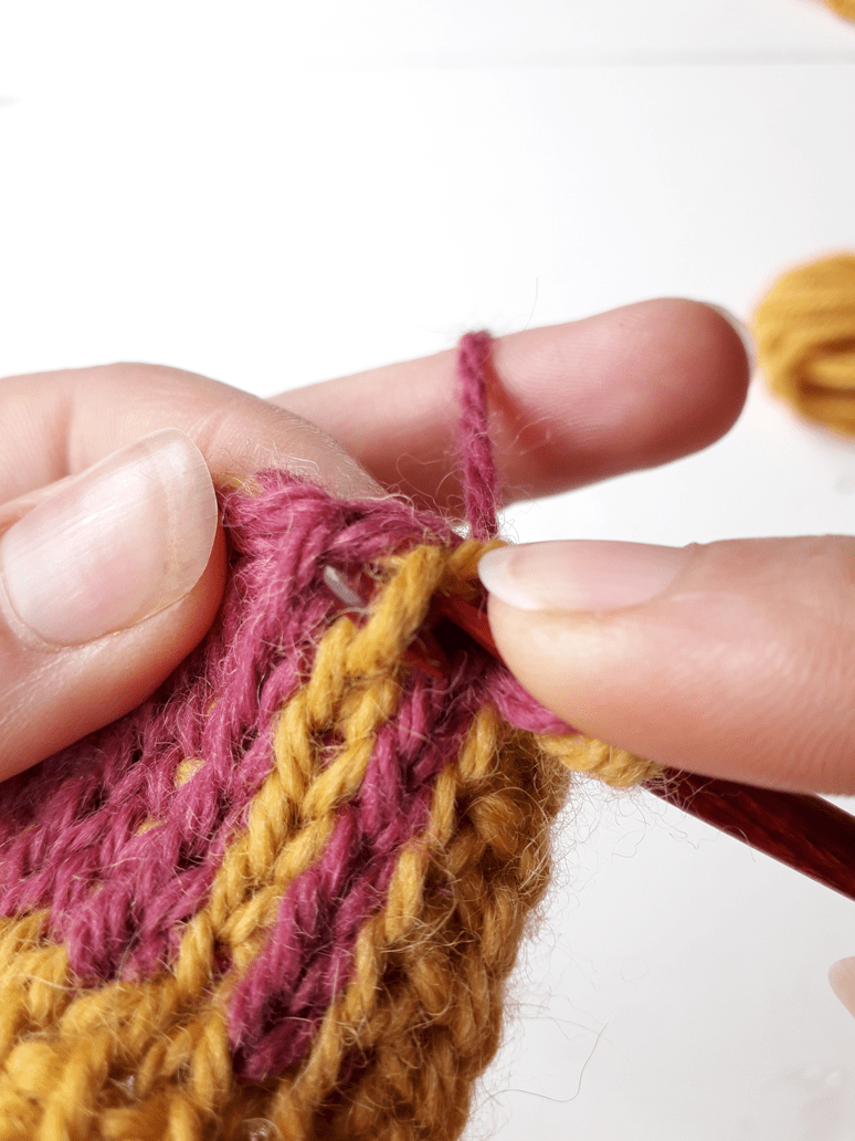 Again, as with the Forward Pass, you don’t need to do this every single stitch, but I recommend you at least do it every few stitches. I catch my return pass floats every second stitch when I’m working mittens.